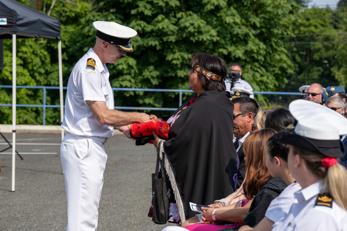 Outgoing Base Commander, Captain (Navy) Jeff Hutchinson, CD, delivers a special gift to Florence Dick a First Nations member to show our thanks and appreciation for all that they have done for the base, at the Base Museum Bldg N-27, Canadian Forces Base Esquimalt, on July 7th 2023. Photo: Cpl Tristan Walach, MARPAC Imaging Services, Esquimalt