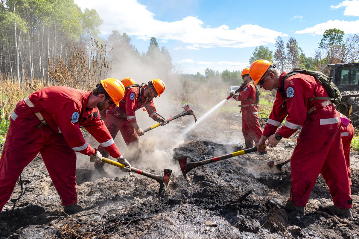 Des membres du premier bataillon du Princess Patricia’s Canadian Light Infantry pulvérisent de l’eau et brisent le sol pour éteindre les points chauds pendant l’opération Lentus près de Burns Lake, le 13 août. Le 13 août, près de Burns Lake : Caporal Alexandre Brisson, Forces armées canadiennes Photo