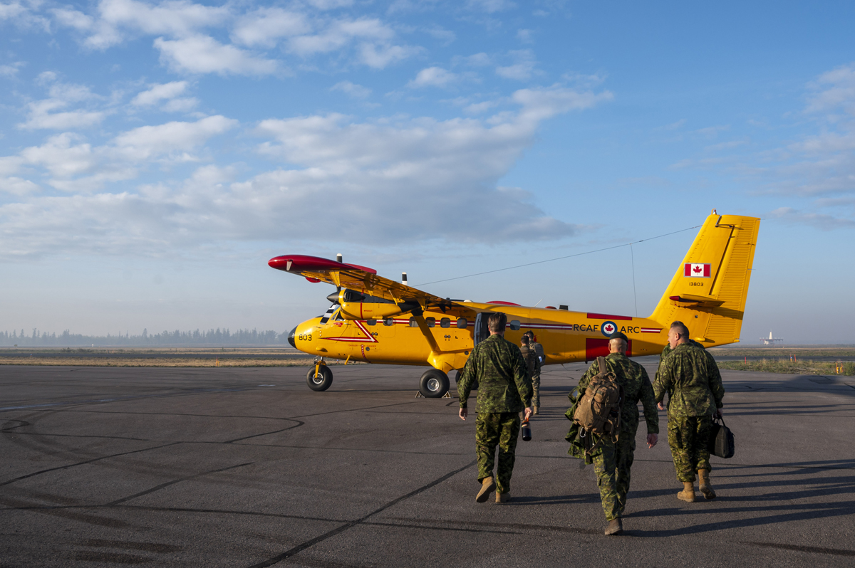Sur le front aérien, l’ARC a fourni des ressources de transport aérien pour la mobilité et les tâches logistiques. Sa flotte se compose d’un CC-130 Hercules, de deux CH-146 Griffons et d’un CC-138 Twin Otter. Le CC-130 Hercules a joué un rôle essentiel dans le transport de 185 pompiers internationaux – 105 du Brésil et 80 du Mexique – vers les lignes de front. Les CH-146 Griffon ont quant à eux facilité la reconnaissance ainsi que l’insertion et l’extraction des pompiers dans les zones reculées. Le Twin Otter s’est concentré sur le transport de personnel. L’Air Task Force, une équipe d’environ 40 personnes, soutenait les opérations aériennes. Les membres de ce groupe provenaient de diverses escadres et de divers escadrons du Canada, dont le 408e Escadron d’hélicoptères de transport d’Edmonton et le 440e Escadron de transport de Yellowknife, renforcés par le personnel de soutien de la 2e Escadre Bagotville, de la 8e Escadre Trenton et de la 19e Escadre Comox.