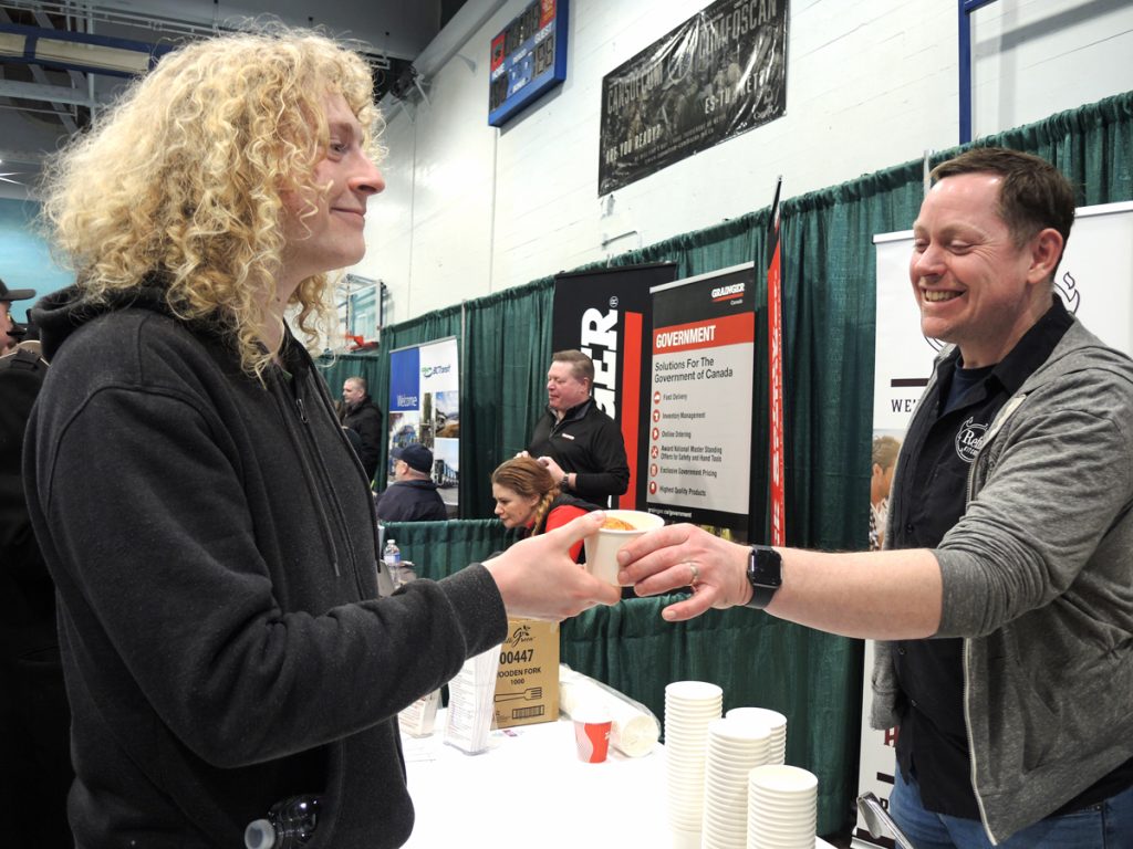 (À droite) Brian Newham, de Refire Kitchen, distribue un échantillon gratuit de nourriture à un visiteur.