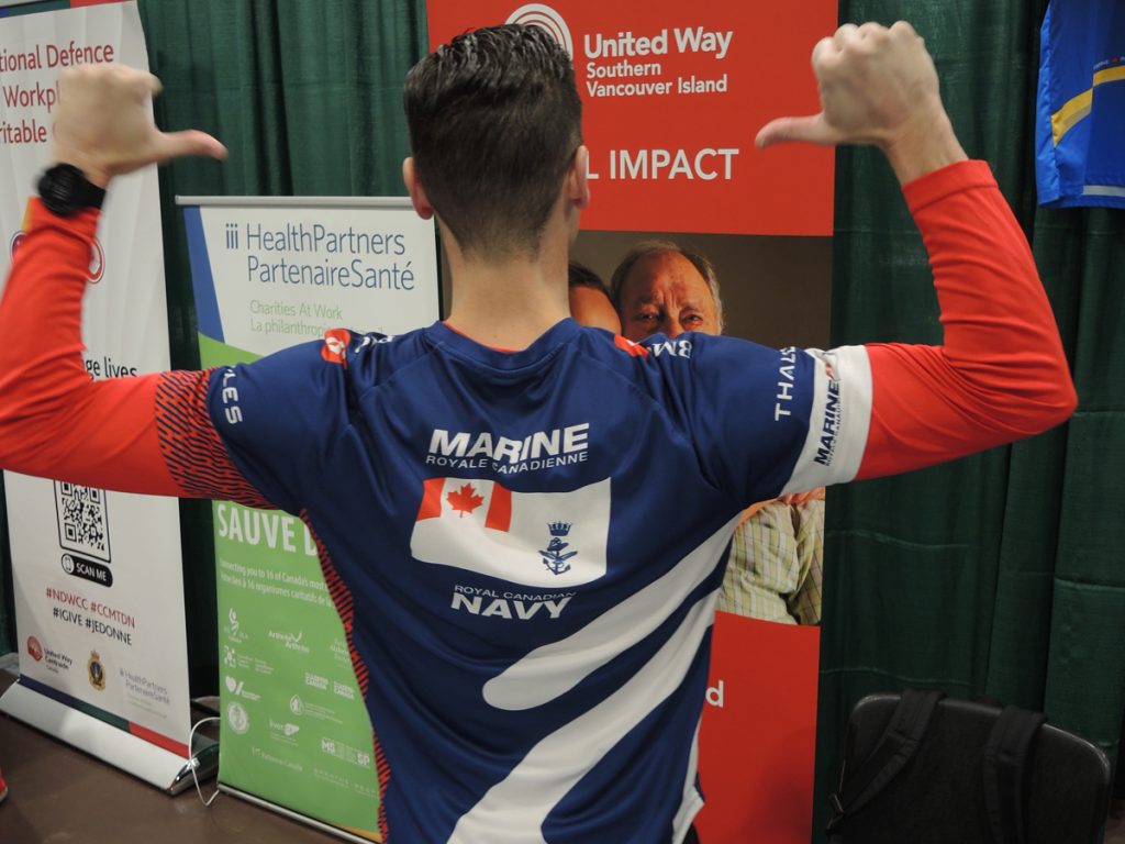 Matt Carlson, responsable des projets pour les affaires publiques de la base, célèbre les réalisations de la Campagne de charité sur le lieu de travail de la Défense nationale à leur stand.