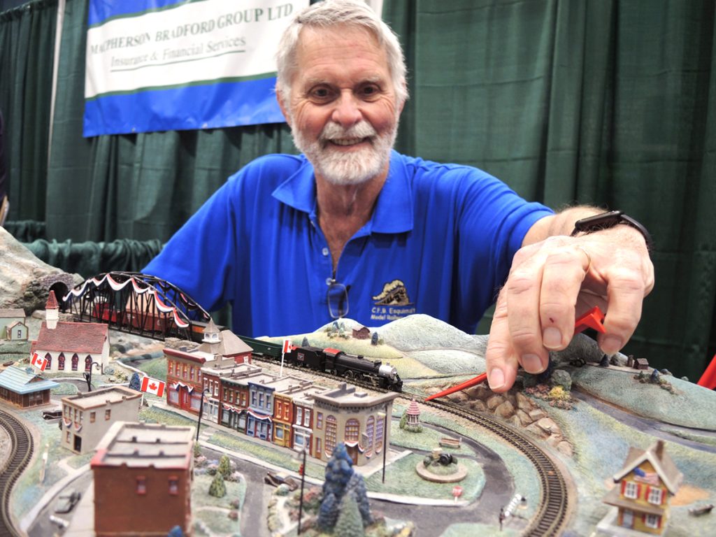 Le matelot de 2e classe (retraité) Ken Silvester, du club de modélisme ferroviaire de la BFC Esquimalt, ajuste une section de la voie ferrée pour son train miniature à l’échelle Z.