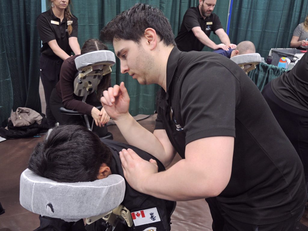 Lars du West Coast College of Massage Therapy masse un membre de l’équipe de défense.