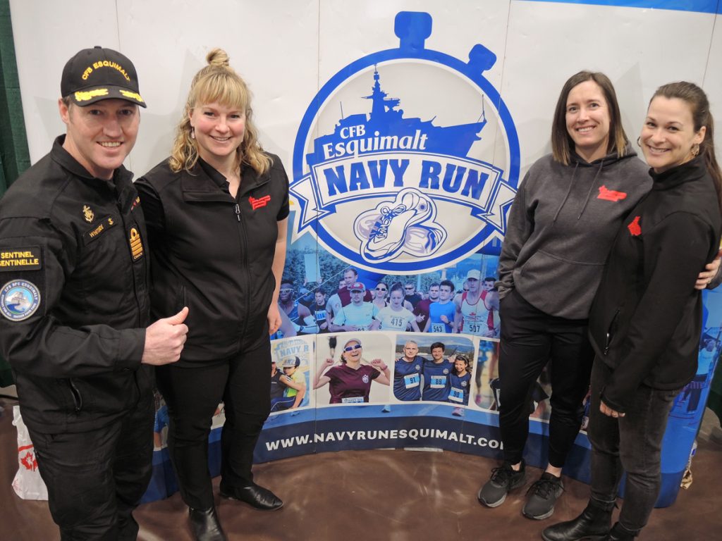 Le Capitaine de vaisseau Kevin Whiteside, commandant de la base de la BFC Esquimalt, s’arrête au stand de la Course de la Marine pour montrer son soutien aux courses de cette année. Les membres des PSP Gillian Larsen, Kamma Frederick et Laurel Koslowski se joignent à lui pour une photo de groupe.