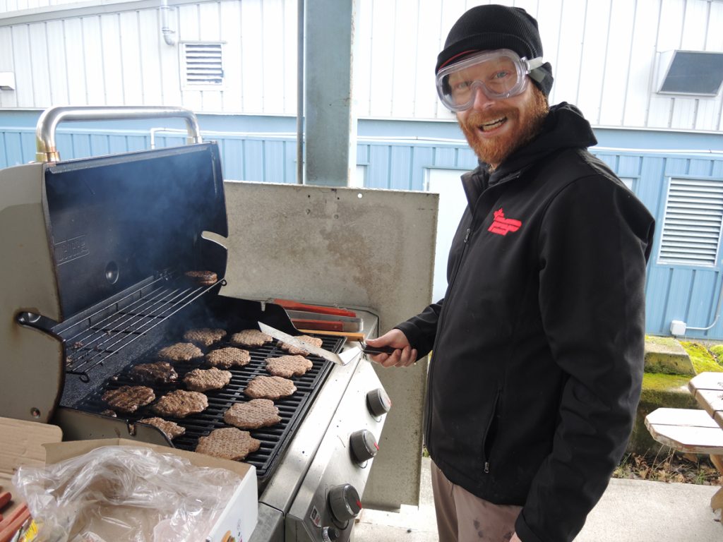 Kodi Gibson, directeur adjoint des PSP, évite les yeux de fumée avec ses lunettes de protection en faisant frire des hamburgers sur le grill à l’extérieur du centre sportif Naden.