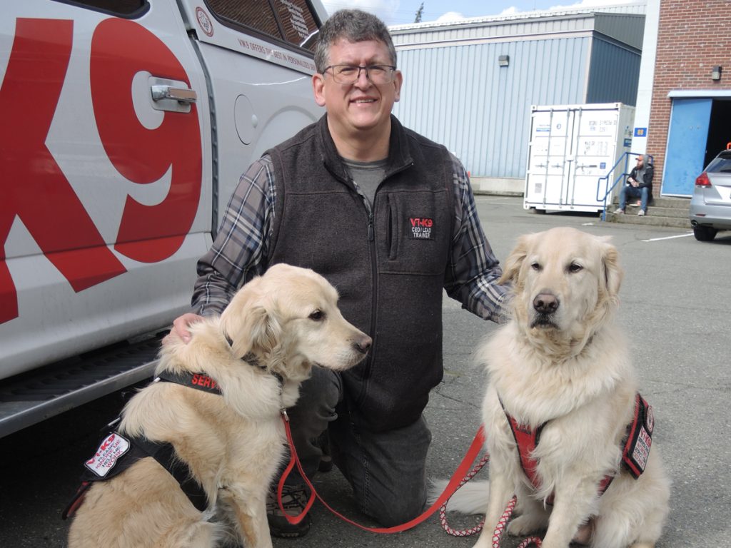Le matelot (retraité) Tyson King, de Vancouver Island K9 Consulting, fait une pause avec ses deux Golden Retrievers Groot et Jack, de couleur crème anglaise.